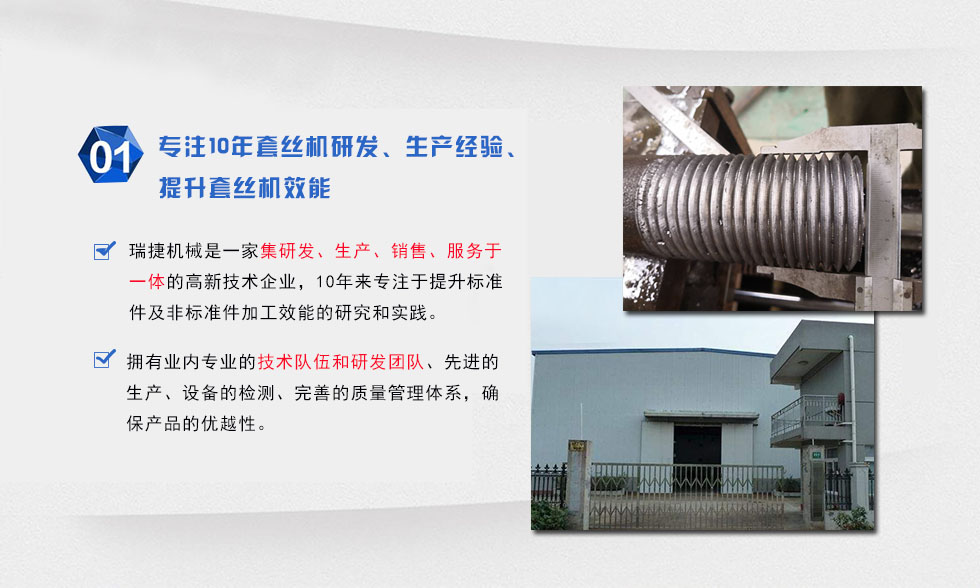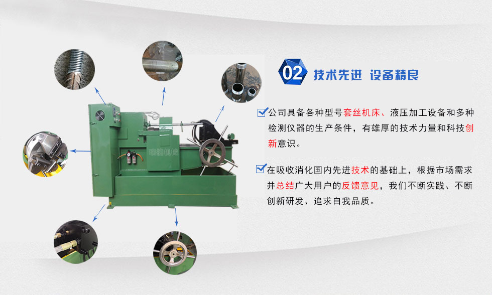 本套絲設備屬于無削加工設備,運用特殊的切削技術,上絲輕盈快捷,提高生產(chǎn)效率,采用三點一線,同心度高,性能穩(wěn)定等優(yōu)點,本機每分鐘可切削3-5根工件,速度快,效率高,對于一些不定長度的鋼結構公司,橋梁工程,電力設施等大企業(yè)的批量生產(chǎn)之需要。