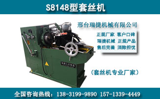 瑞捷套絲機設備采用液壓裝置成功解決勞動強度大,效率低,且無定位裝置,絲扣長短難控制等弊端,可一次型完成螺紋加工成型且螺紋牙形飽滿光滑。套絲機的主要部件及結構是由套絲機床的傳動系統(tǒng),支架系統(tǒng),切線板牙頭,定位裝置及液壓系統(tǒng)組成,工作時只要將工件裝入夾鉗,其余程序?qū)⒆詣油瓿桑僮骱唵危ㄋ滓锥鸾萏捉z機廠家直銷,質(zhì)量有保證,減少不必要的中間環(huán)節(jié),為客戶帶來實實在在的優(yōu)惠政策,歡迎新老客戶洽談合作事宜和來電咨詢.